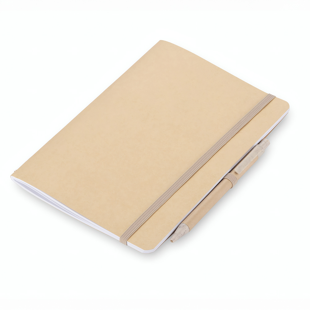 Komplekti kuuluv pastakas on valmistatud taaskasutatud paberist ning selle detailides on kasutatud nisukõrre lisandiga plastikut. Märkmik sulgub elastse kummipaelaga, mis aitab sisu korras hoida ja muudab komplekti mugavaks igapäevaseks kasutamiseks.